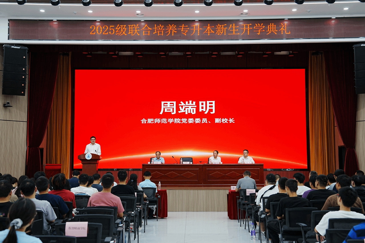 周端明在致辞中向2025级专升本新生表示热烈欢迎,并详细介绍了合肥师范学院的办学历史、特色理念及育人成果。他深入阐释了“爱满天下、知行合一”校训的深刻内涵,并对新生提出三点期望:一要崇德修身,锻造勇于担当的品质;二要明确目标,做知行合一、以知促行、以行求知;三要厚植家国情怀,不负时代使命。